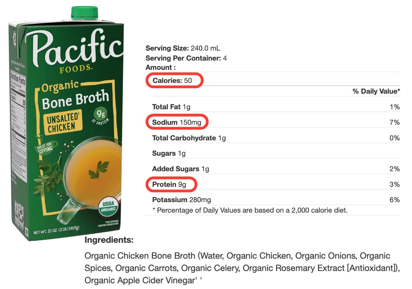 The Kettle & Fire Chicken Bone Broth is again high in sodium. I was able to find an unsalted variety of the Pacific, which comes in at a reasonable 150 mg per cup (or 300 mg for 2 cups). It’s a good reminder that choosing unsalted or low-sodium versions is the way to go.