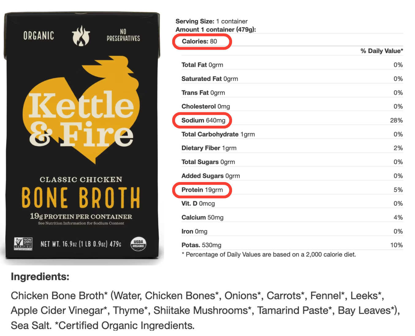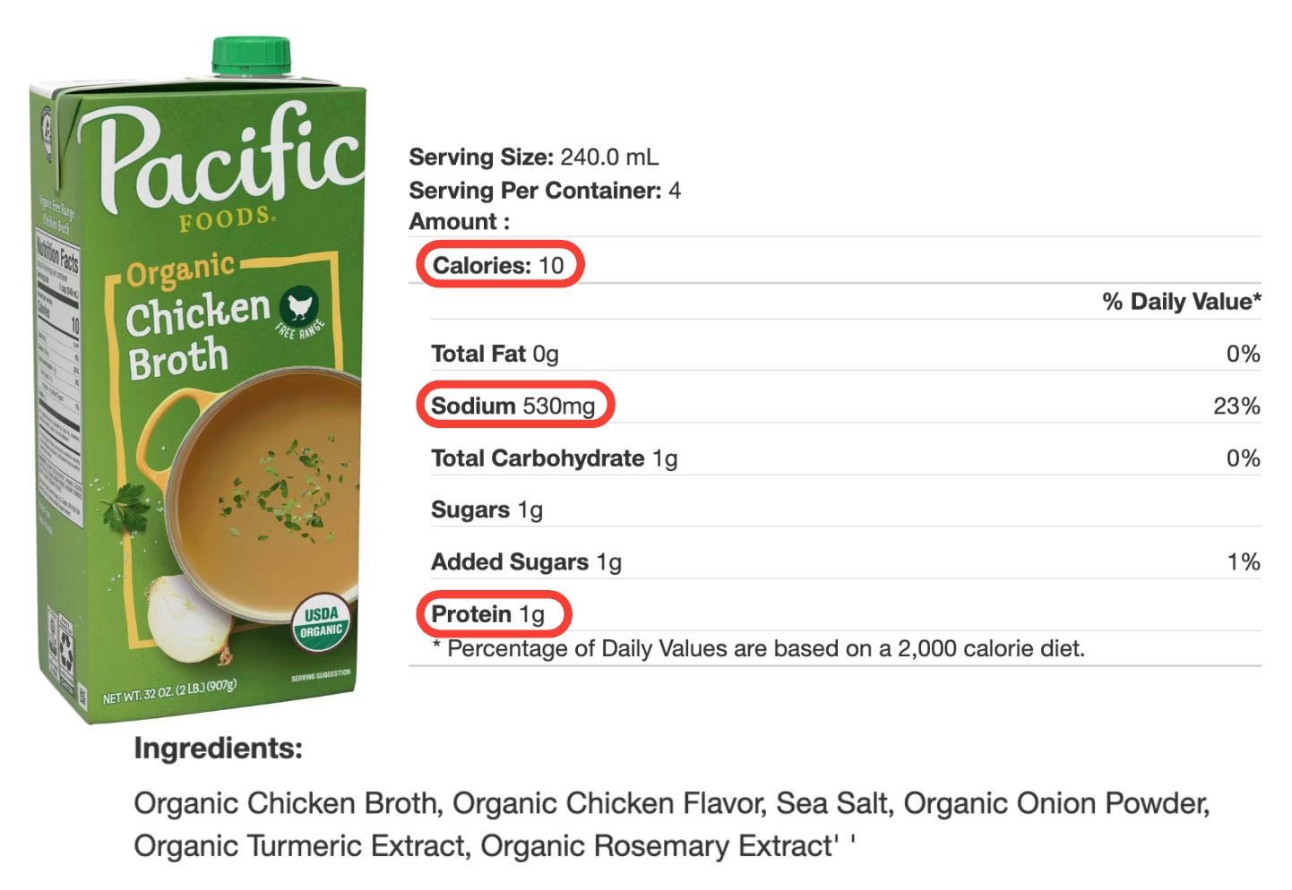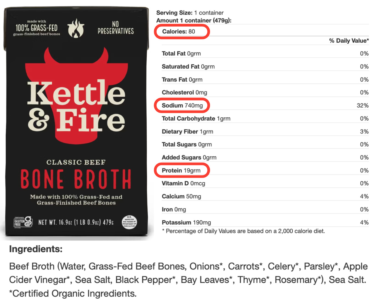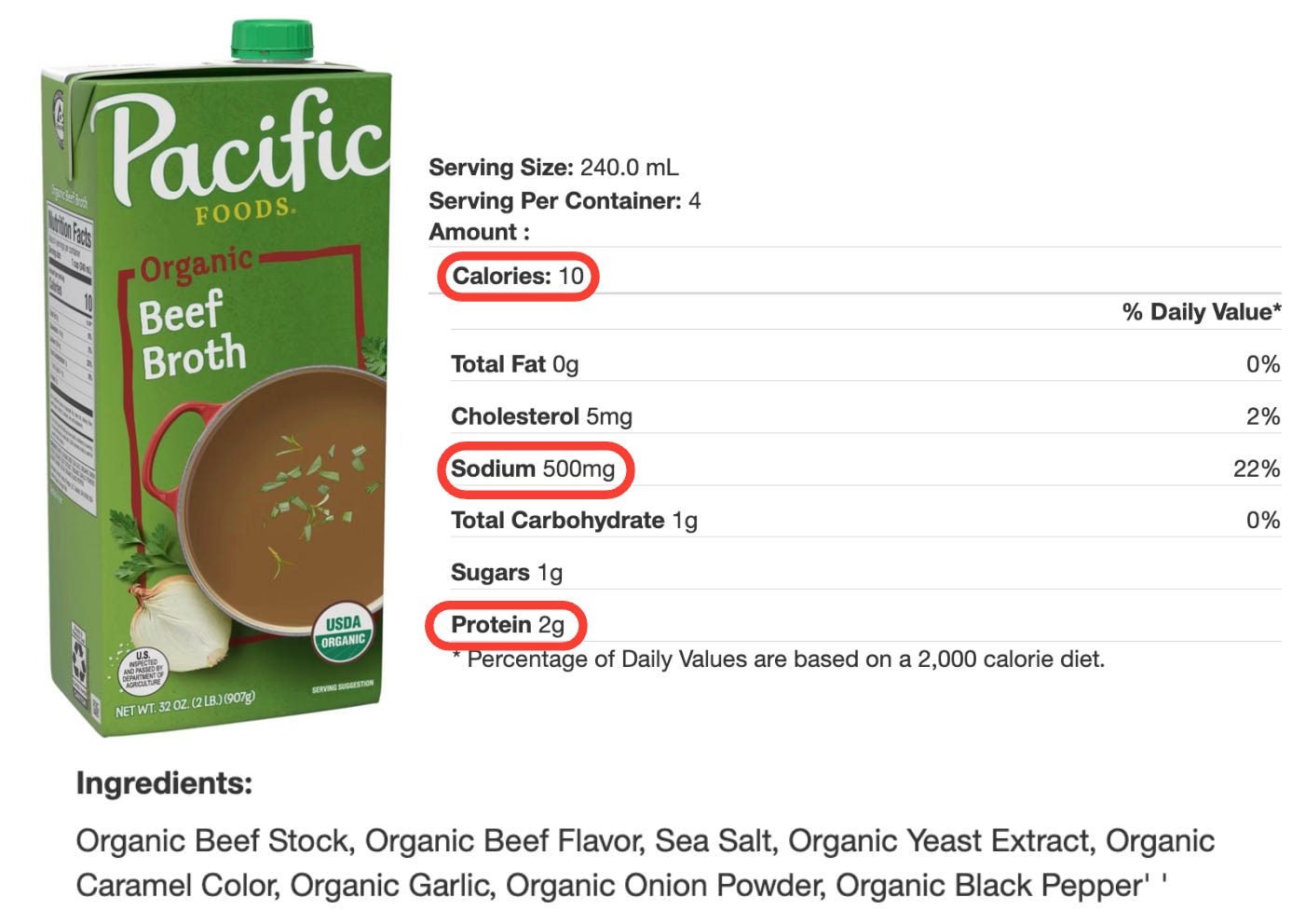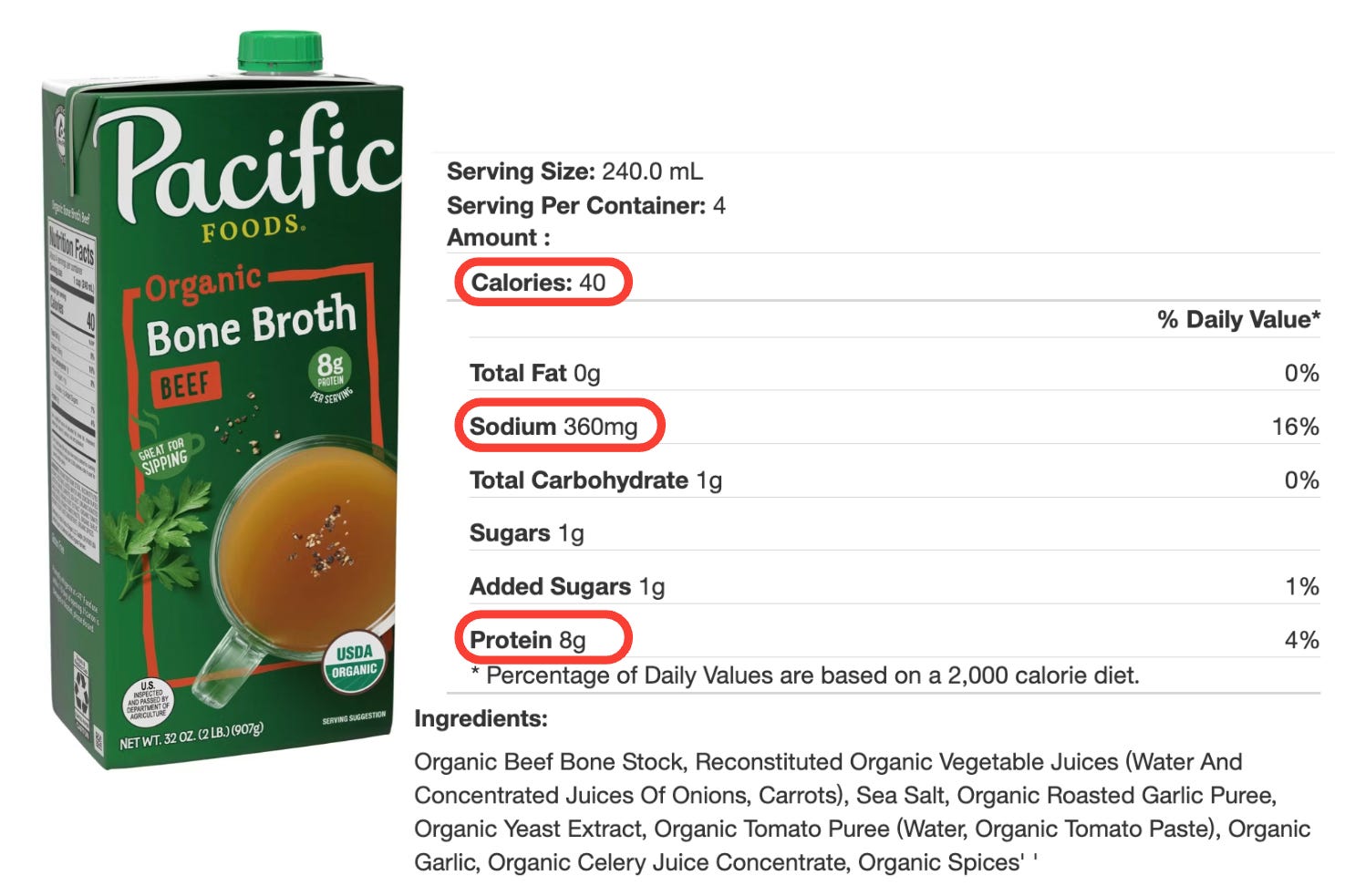 Make sure you’re comparing apples to apples when it comes to serving size. The Kettle & Fire Beef Bone Broth lists one container (16 ounces, or 2 cups) as a serving, while the Pacific Beef Bone Broth looks better at first glance but uses a smaller 8-ounce (1-cup) serving. The same goes for the Pacific Beef Broth. From a sodium standpoint, the bone broths come out ahead—and they also deliver more protein (about 9.5 grams per cup compared to just 2 grams in regular beef broth).