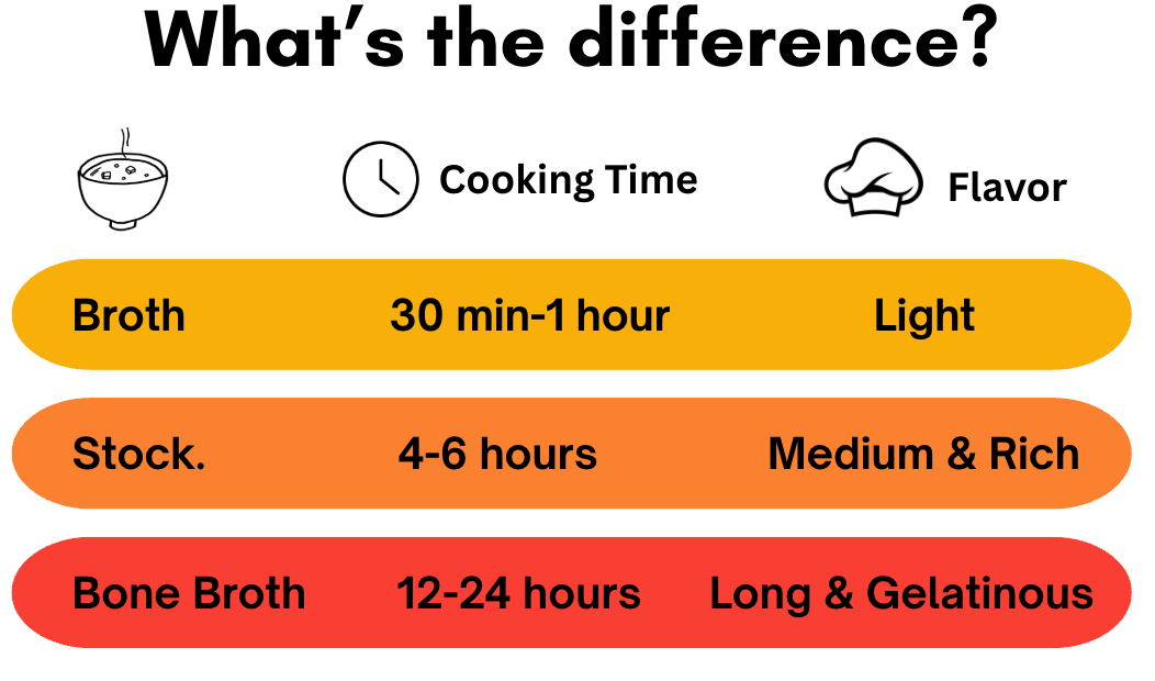 Stock: Made primarily from bones and some vegetables like onions, carrots, and celery, simmered 4–6 hours. Richer, more body, but still relatively quick to make. Salt is never added. It is meant to be an ingredient in a broader recipe.