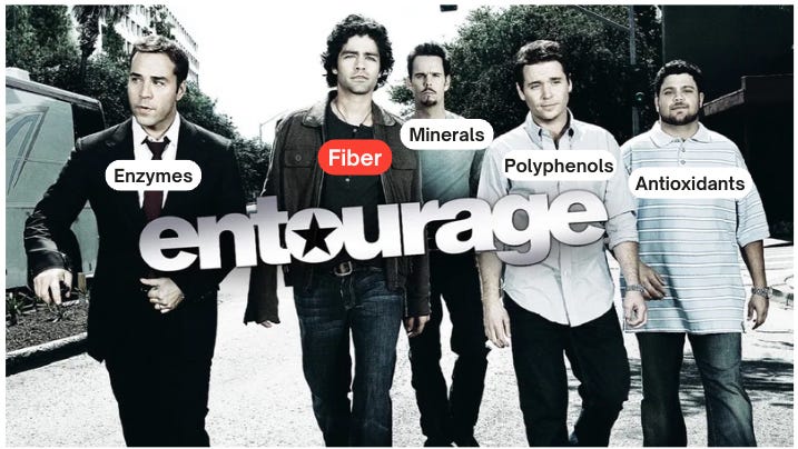 The entourage effect refers to how nutrients perform best when consumed with other naturally occurring compounds in whole foods. Fiber is great, but it works even better alongside antioxidants, polyphenols, enzymes, and minerals. Together, they amplify each other’s benefits. Strip one from the group, and the synergy fades. It’s not that isolated nutrients are useless—they’re just not as effective without context. It’s the difference between a Jonas brother and The Jonas Brothers.